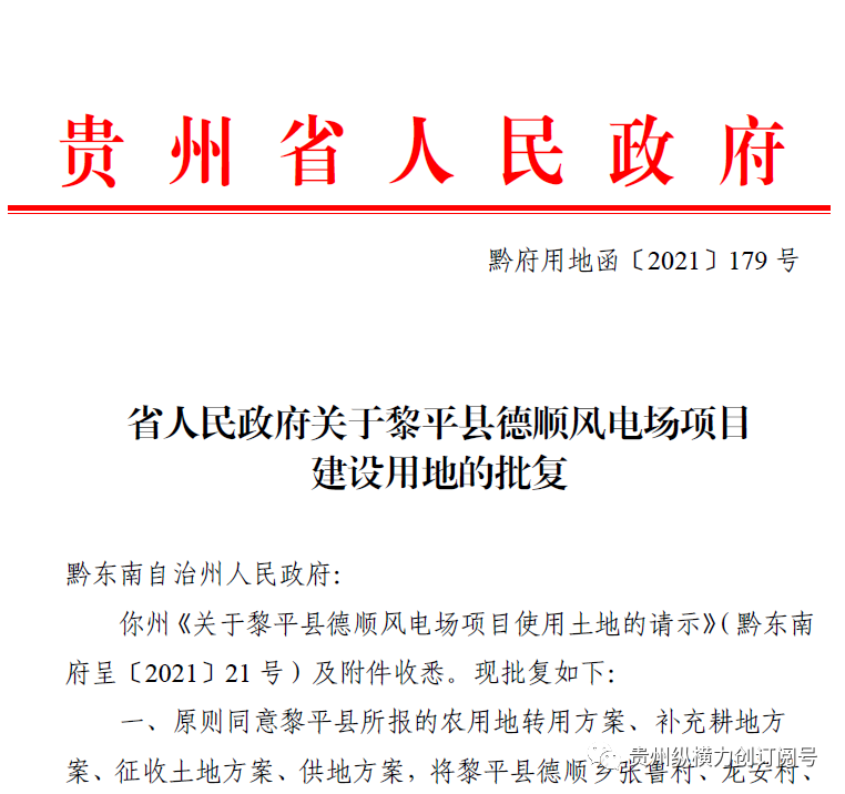 我公司承接的黎平县德顺风电场用地报批项目于2021年9月经贵州省人民政府审批发文《关于黎平县德顺风电场项目建设用地的批复》,拿到正式用地的批复。